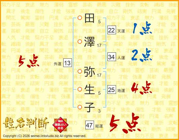田(5画)澤(17画) 弥(17画)生(5画)子(3画)