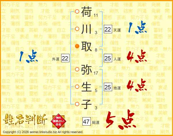 荷(11画)川(3画)取(8画) 弥(17画)生(5画)子(3画)