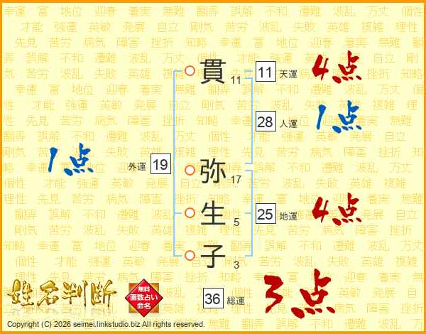 貫(11画) 弥(17画)生(5画)子(3画)