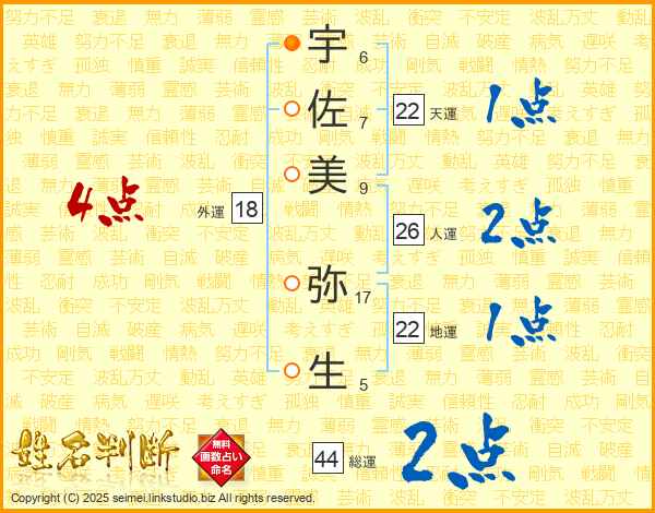 宇(6画)佐(7画)美(9画) 弥(17画)生(5画)