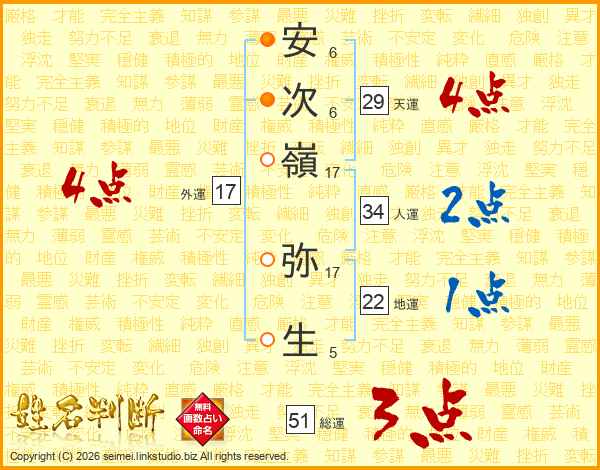 安(6画)次(6画)嶺(17画) 弥(17画)生(5画)