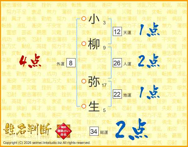 生活面を象徴する運勢です。外部から受ける影響力を表し、結婚運、家庭運や職場、環境への順応性を表します。総運から人運を引いた画数。姓や名が1文字の場合を除く。