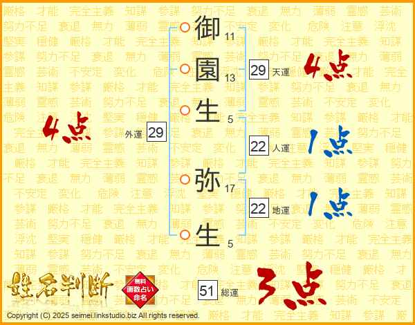 御(11画)園(13画)生(5画) 弥(17画)生(5画)