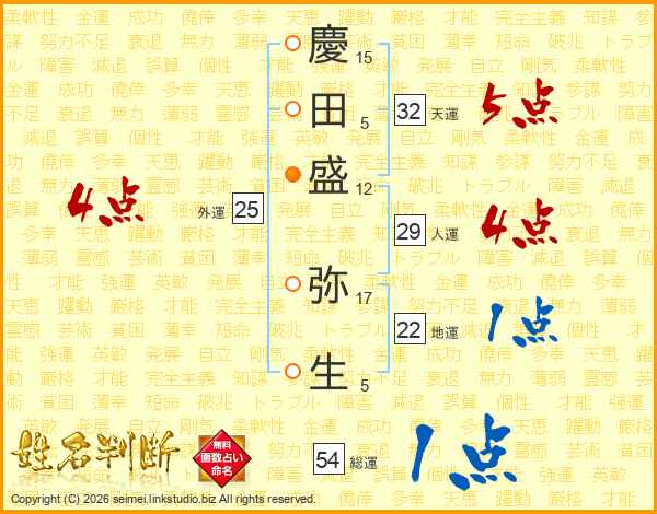 慶(15画)田(5画)盛(12画) 弥(17画)生(5画)
