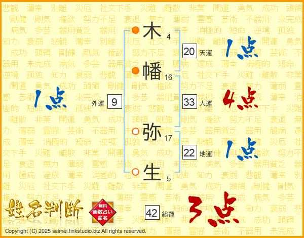 木(4画)幡(16画) 弥(17画)生(5画)