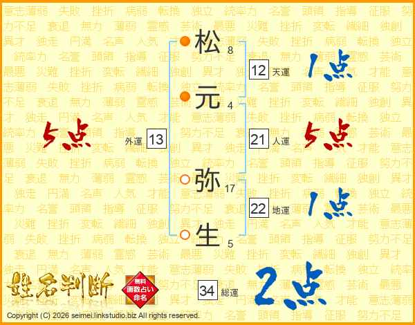 あなたの人生を表す1番重要な運勢です。生涯を通じて影響する総合運となり、主に50歳以降の晩年期に影響を及ぼします。苗字と名前の合計画数。