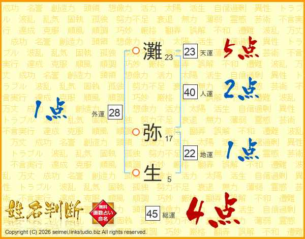 生活面を象徴する運勢です。外部から受ける影響力を表し、結婚運、家庭運や職場、環境への順応性を表します。総運から人運を引いた画数。姓や名が1文字の場合を除く。