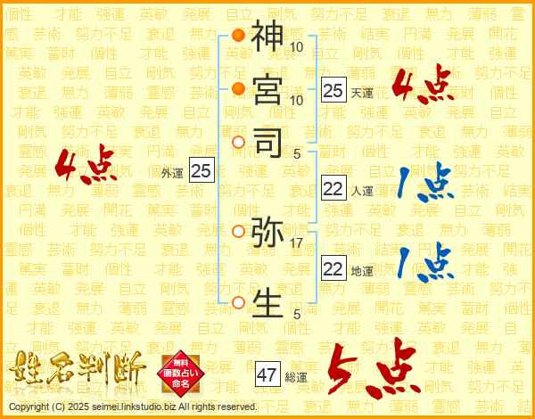 神(10画)宮(10画)司(5画) 弥(17画)生(5画)