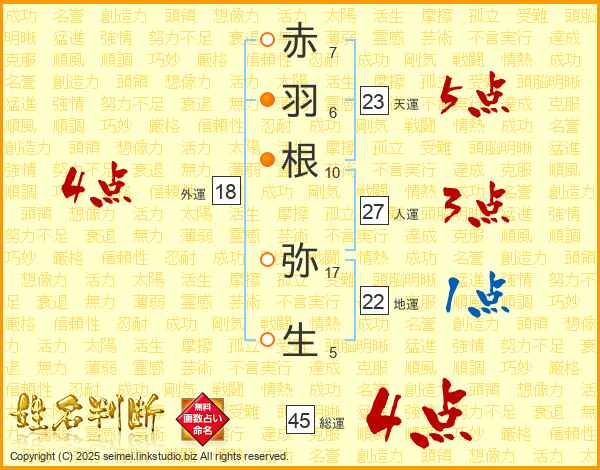 赤(7画)羽(6画)根(10画) 弥(17画)生(5画)