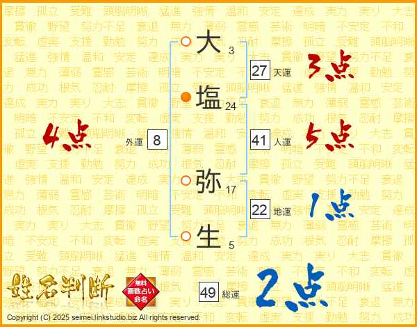 生活面を象徴する運勢です。外部から受ける影響力を表し、結婚運、家庭運や職場、環境への順応性を表します。総運から人運を引いた画数。姓や名が1文字の場合を除く。