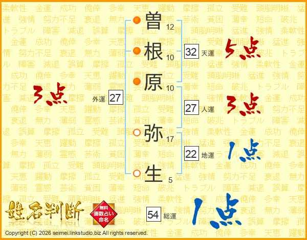 曽(12画)根(10画)原(10画) 弥(17画)生(5画)