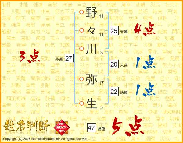 野(11画)々(11画)川(3画) 弥(17画)生(5画)
