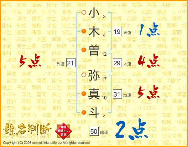 小(3画)木(4画)曽(12画) 弥(17画)真(10画)斗(4画)
