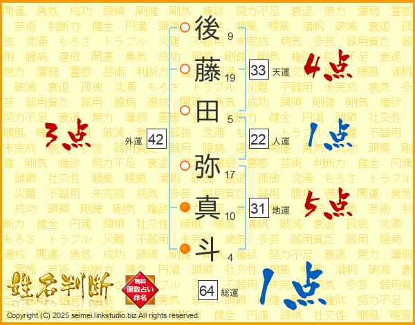 後(9画)藤(19画)田(5画) 弥(17画)真(10画)斗(4画)