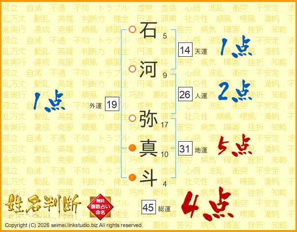 石(5画)河(9画) 弥(17画)真(10画)斗(4画)