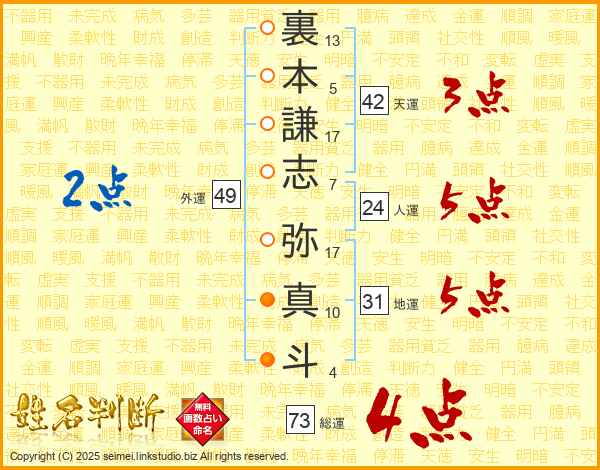 裏(13画)本(5画)謙(17画)志(7画) 弥(17画)真(10画)斗(4画)