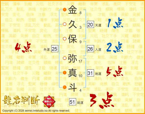 金(8画)久(3画)保(9画) 弥(17画)真(10画)斗(4画)