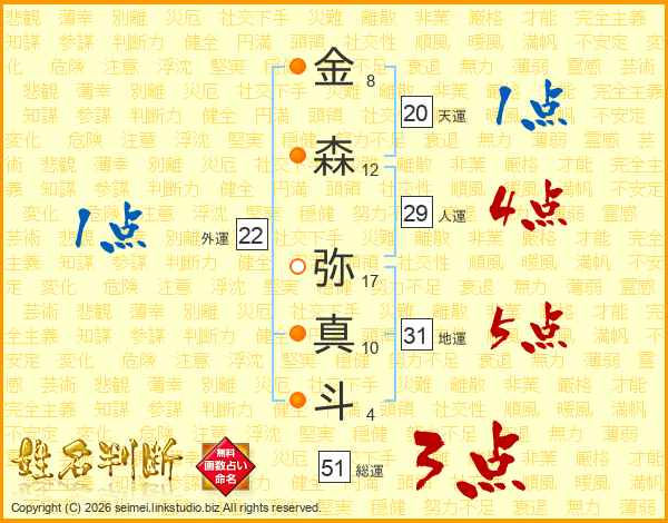 金(8画)森(12画) 弥(17画)真(10画)斗(4画)