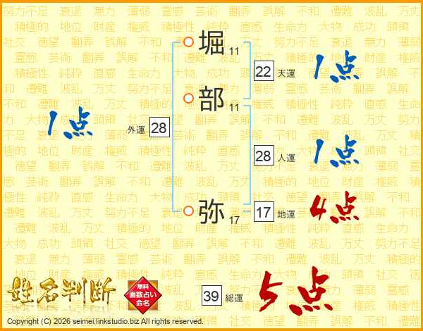 生活面を象徴する運勢です。外部から受ける影響力を表し、結婚運、家庭運や職場、環境への順応性を表します。総運から人運を引いた画数。姓や名が1文字の場合を除く。
