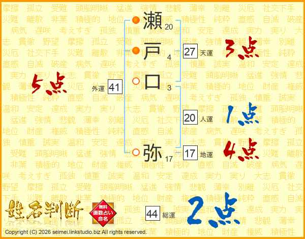 瀬戸口弥さんの総運は44画の2点!