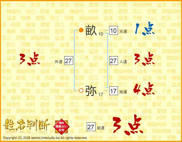 生活面を象徴する運勢です。外部から受ける影響力を表し、結婚運、家庭運や職場、環境への順応性を表します。総運から人運を引いた画数。姓や名が1文字の場合を除く。