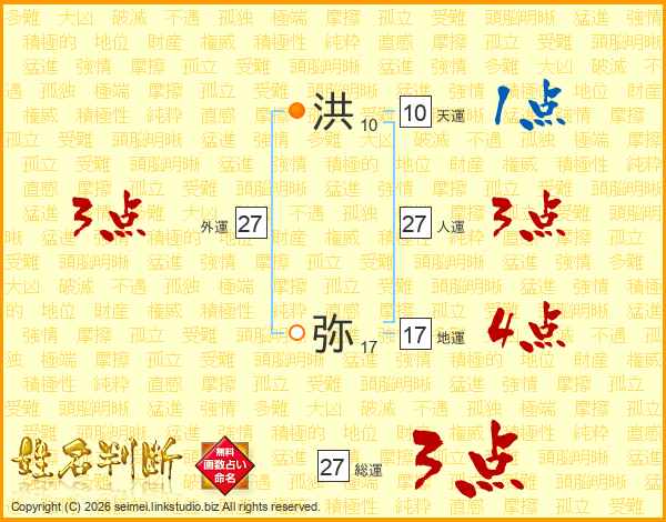 生活面を象徴する運勢です。外部から受ける影響力を表し、結婚運、家庭運や職場、環境への順応性を表します。総運から人運を引いた画数。姓や名が1文字の場合を除く。