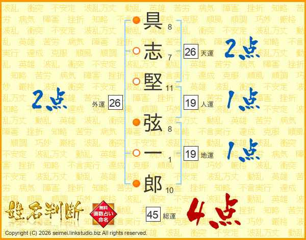 具(8画)志(7画)堅(11画) 弦(8画)一(1画)郎(10画)