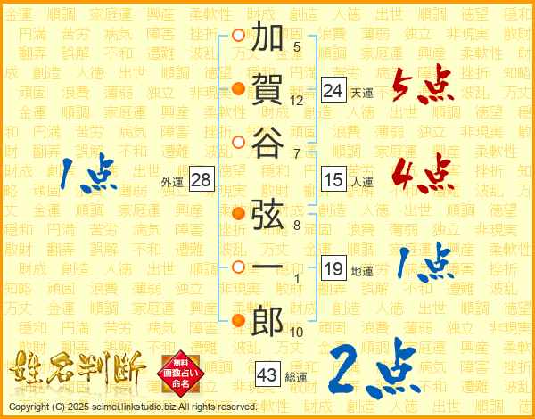 加(5画)賀(12画)谷(7画) 弦(8画)一(1画)郎(10画)
