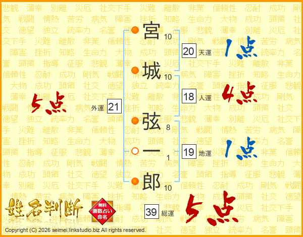 宮(10画)城(10画) 弦(8画)一(1画)郎(10画)