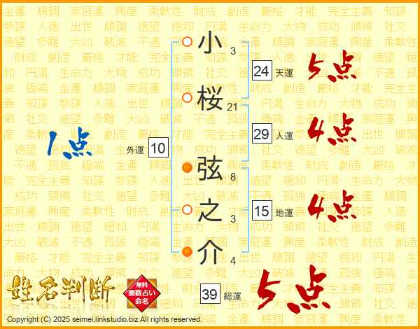 小桜弦之介さんの総運は39画の5点!