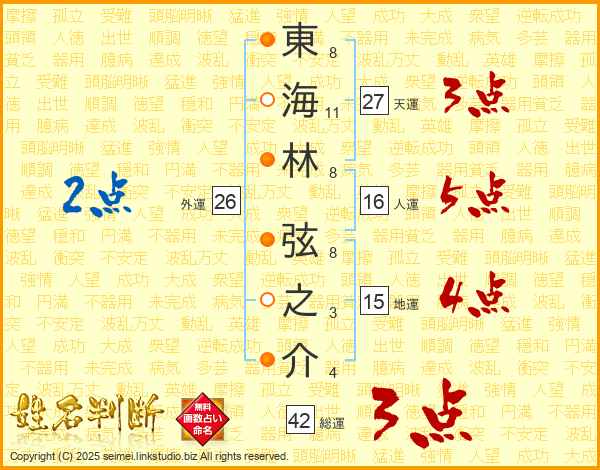 東(8画)海(11画)林(8画) 弦(8画)之(3画)介(4画)