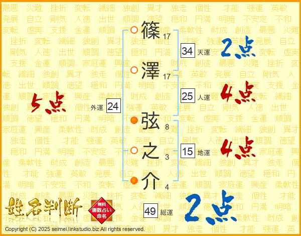 篠(17画)澤(17画) 弦(8画)之(3画)介(4画)