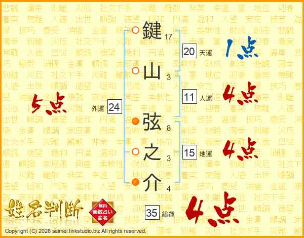 鍵(17画)山(3画) 弦(8画)之(3画)介(4画)