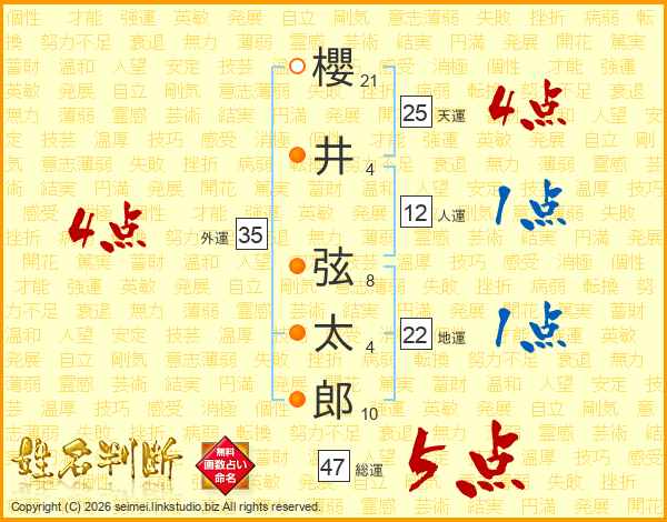 櫻(21画)井(4画) 弦(8画)太(4画)郎(10画)