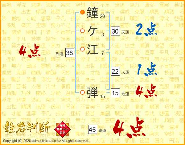 鐘(20画)ケ(3画)江(7画) 弾(15画)