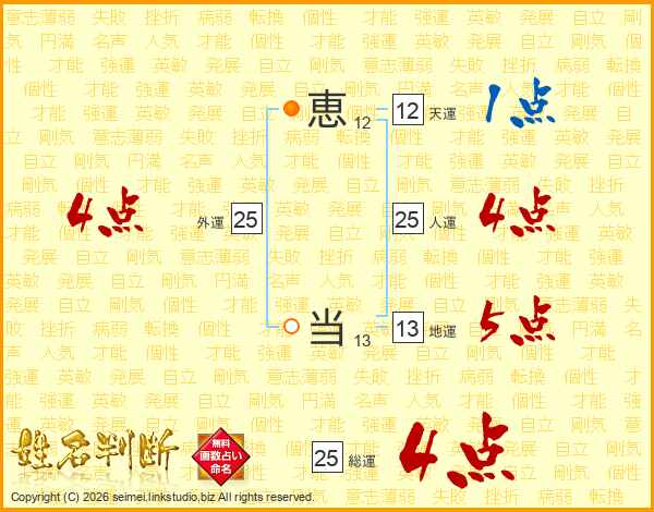 生活面を象徴する運勢です。外部から受ける影響力を表し、結婚運、家庭運や職場、環境への順応性を表します。総運から人運を引いた画数。姓や名が1文字の場合を除く。