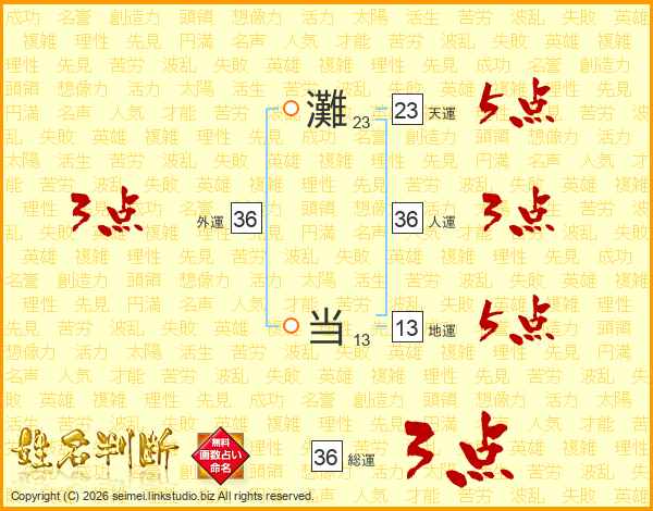 生活面を象徴する運勢です。外部から受ける影響力を表し、結婚運、家庭運や職場、環境への順応性を表します。総運から人運を引いた画数。姓や名が1文字の場合を除く。