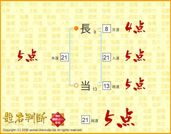 あなたの人生を表す1番重要な運勢です。生涯を通じて影響する総合運となり、主に50歳以降の晩年期に影響を及ぼします。苗字と名前の合計画数。