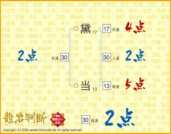 生活面を象徴する運勢です。外部から受ける影響力を表し、結婚運、家庭運や職場、環境への順応性を表します。総運から人運を引いた画数。姓や名が1文字の場合を除く。