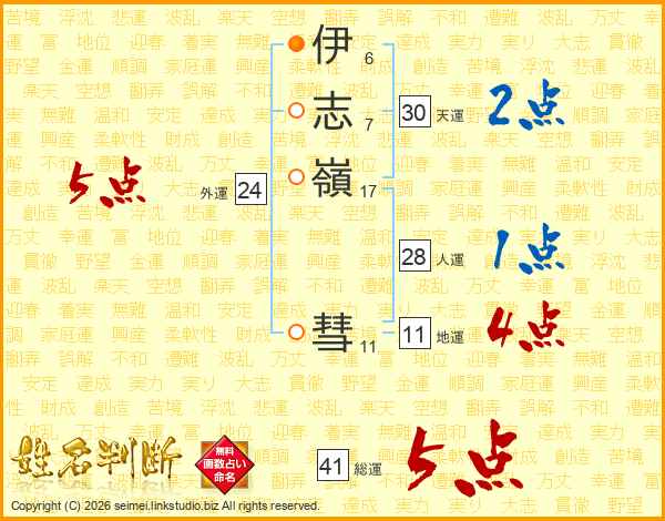 伊(6画)志(7画)嶺(17画) 彗(11画)