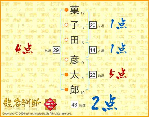 菓(12画)子(3画)田(5画) 彦(9画)太(4画)郎(10画)