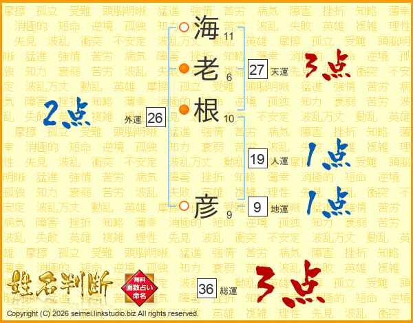 あなたの人生を表す1番重要な運勢です。生涯を通じて影響する総合運となり、主に50歳以降の晩年期に影響を及ぼします。苗字と名前の合計画数。