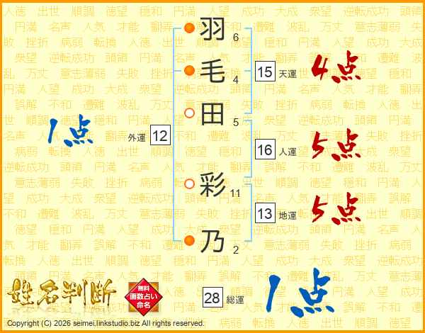 羽毛田彩乃さんの総運は28画の1点!