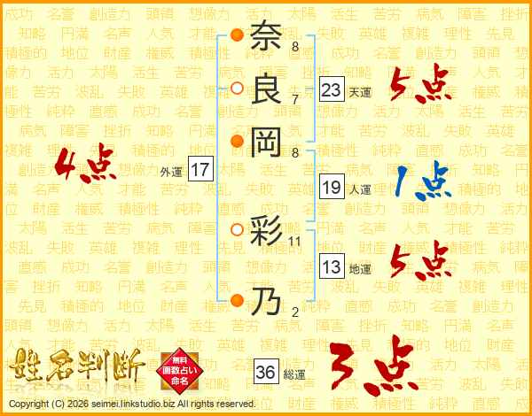 奈(8画)良(7画)岡(8画) 彩(11画)乃(2画)