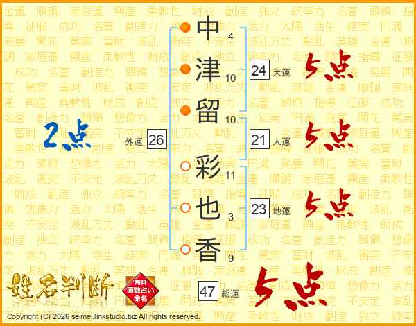 中(4画)津(10画)留(10画) 彩(11画)也(3画)香(9画)