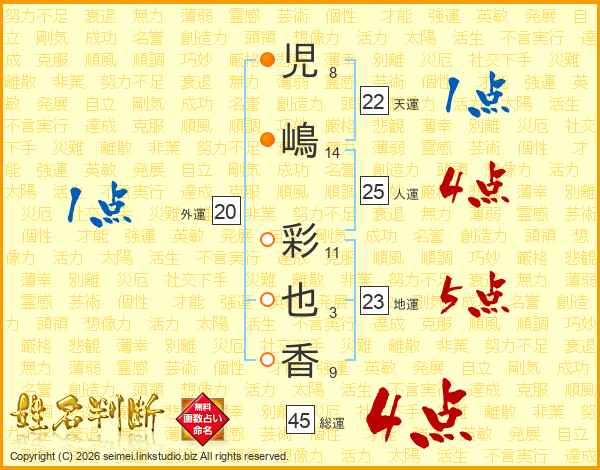 児(8画)嶋(14画) 彩(11画)也(3画)香(9画)