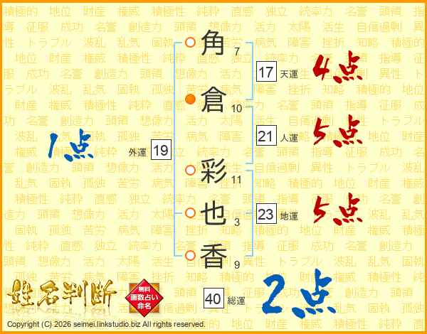 角(7画)倉(10画) 彩(11画)也(3画)香(9画)