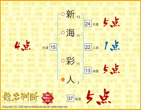 新海彩人さんの総運は37画の5点!