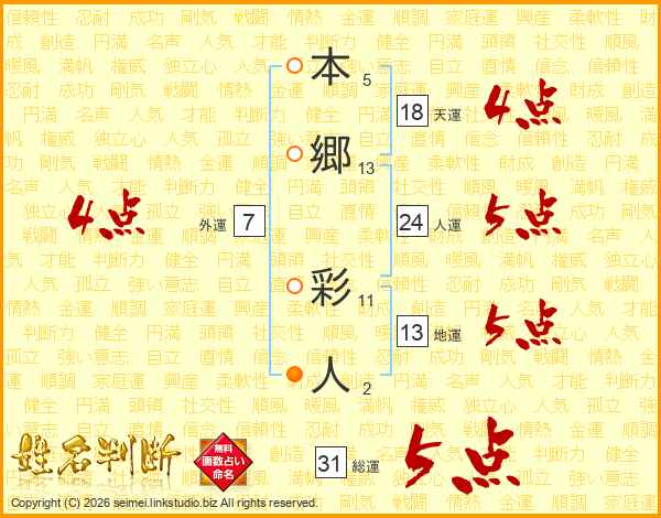 あなたの人生を表す1番重要な運勢です。生涯を通じて影響する総合運となり、主に50歳以降の晩年期に影響を及ぼします。苗字と名前の合計画数。