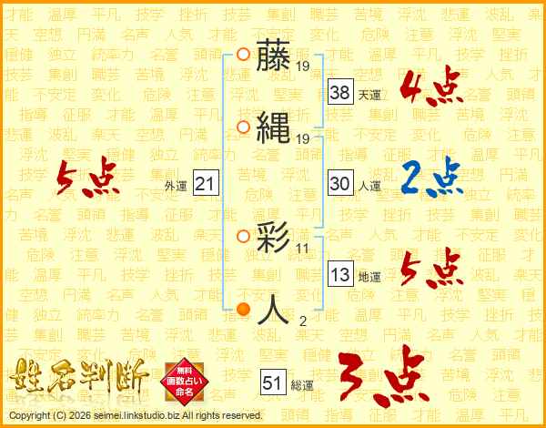 藤(19画)縄(19画) 彩(11画)人(2画)